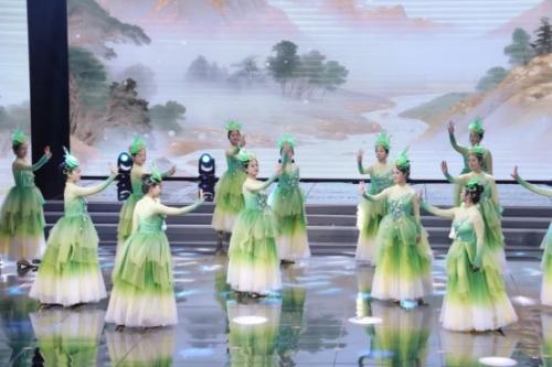 伴随着《中华泰山》悠扬的歌声,学院舞蹈表演专业学生身着绿色舞裙,踏着旋律的节拍轻盈起舞。她们以柔美而富有张力的肢体语言,为歌曲增添了灵动的视觉表达,时而如泰山松涛轻拂,时而似云海气势翻涌,将舞蹈与泰山意象完美合呈现了泰山的雄奇与灵秀。