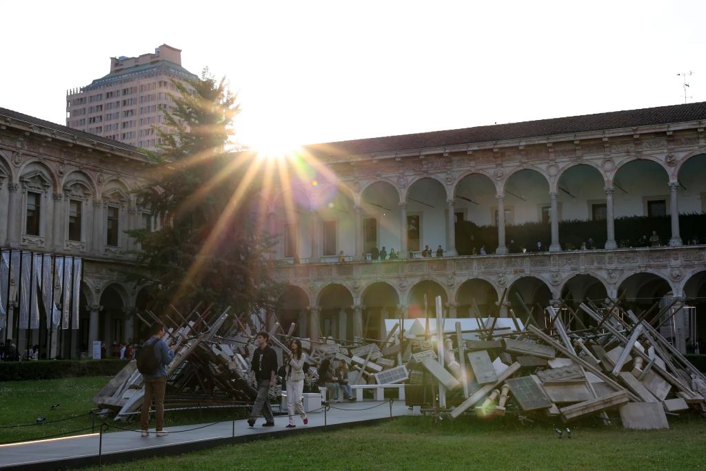 4月20日,在意大利米兰大学,人们参观米兰设计周展品。