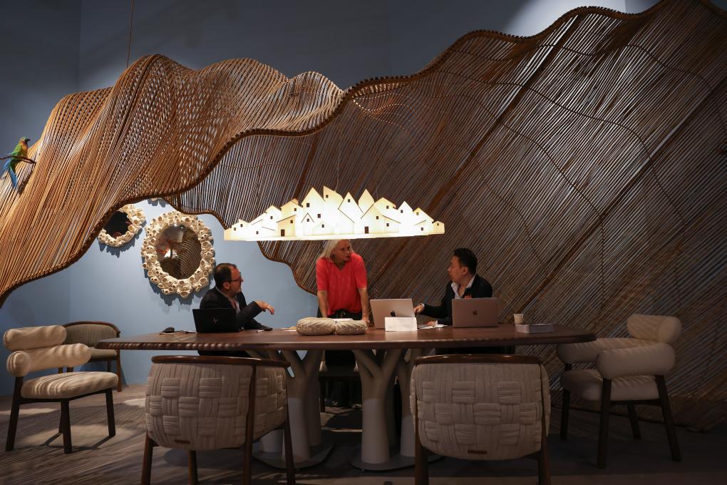 4月21日,在意大利米兰国际会展中心,展商在米兰家具展上洽谈。