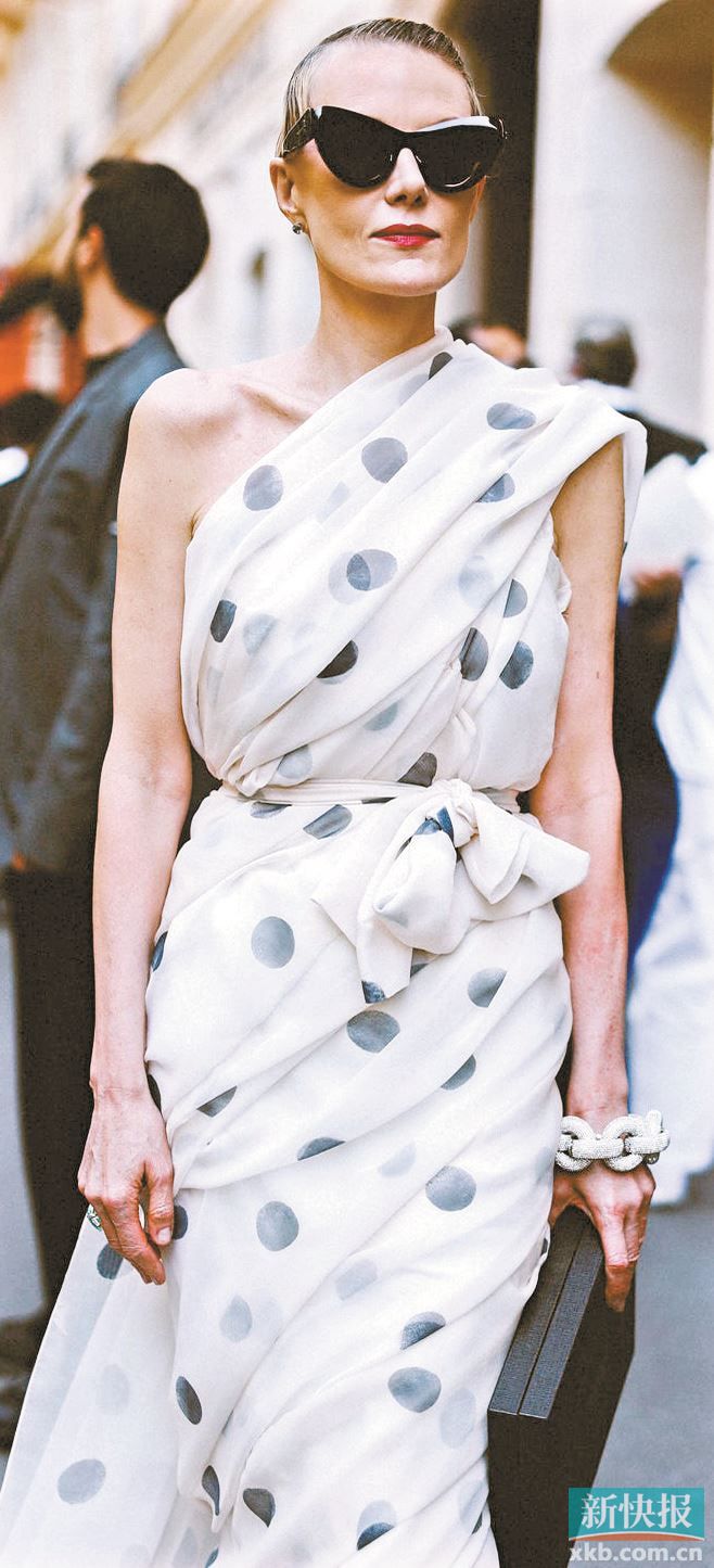喜欢街头松弛感的时髦精可选宽松版型的斜肩T恤,搭工装短裤或破洞牛仔裤,再将下摆打结露出腰线,营造美式复古感。热衷体现造型优雅的时髦精,单肩连衣裙是不二之选,配尖头高跟鞋以及富有质感的金属或珍珠饰品,瞬间提升气场。还可尝试材质“对冲”,如皮革单肩上衣搭垂感阔腿裤,硬朗与柔美形成反差。(记者 梁彧)