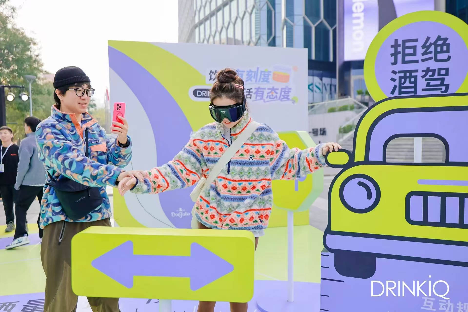 现场最热闹的莫过于“安全回家不酒驾”体验区。在一个个障碍物前,戴着“醉酒模拟眼镜”的参与者摇摇晃晃,磕磕绊绊越过障碍物,难以控制的身体和真实的眩晕感,让人们真切感受到了酒驾和醉驾的危险。