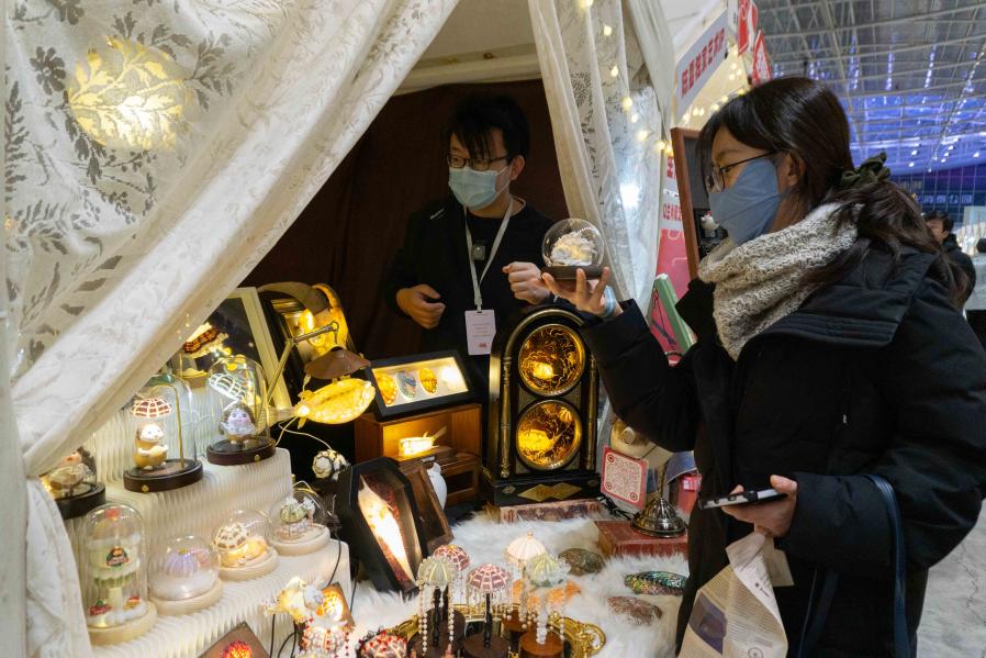 市集上,小唐马摆件、生肖造型小夜灯、创意酒具等实用物件引来众多人驻足。记者了解得知,这些都是北京市级非遗“北京刻瓷”代表性传承人周晓明创作的文创产品,灵感均源自文物。周晓明表示:“让文物走进生活场景,打破人们对非遗‘高不可攀’的刻板印象,是我们非遗传承人当下该做的事。”