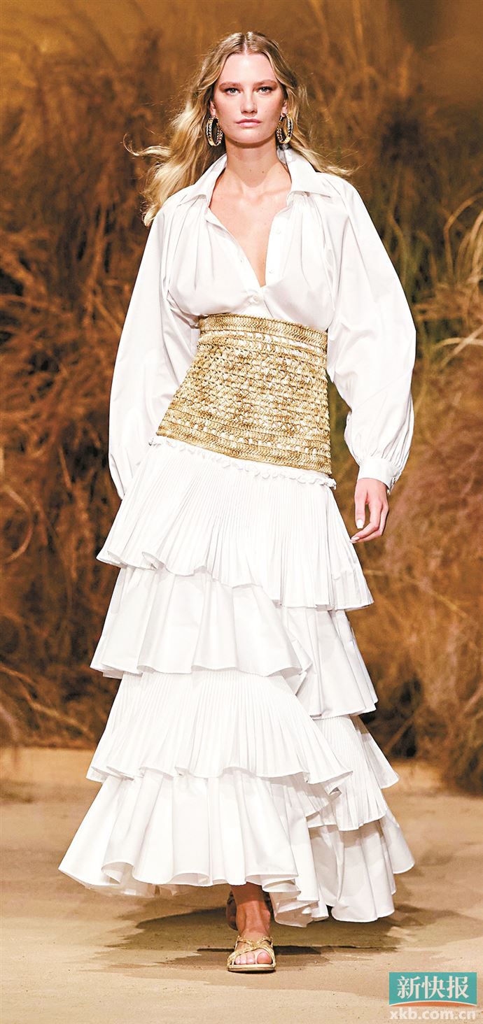 除了裙摆,领口与肩线的不对称层叠也极具特色,有的采用单肩设计即一侧肩线无装饰,简洁利落,而另一侧肩线则层叠荷叶边或蕾丝,从肩线延伸至腰线,形成不对称层叠效果,既修饰肩颈线条,又增添个性;有的则将领口设计为不对称结构,一侧领口层叠褶皱,另一侧领口简洁流畅,搭配层叠的裙摆,令整体造型穿搭既灵动又错落有致不呆板。(记者 梁彧)
