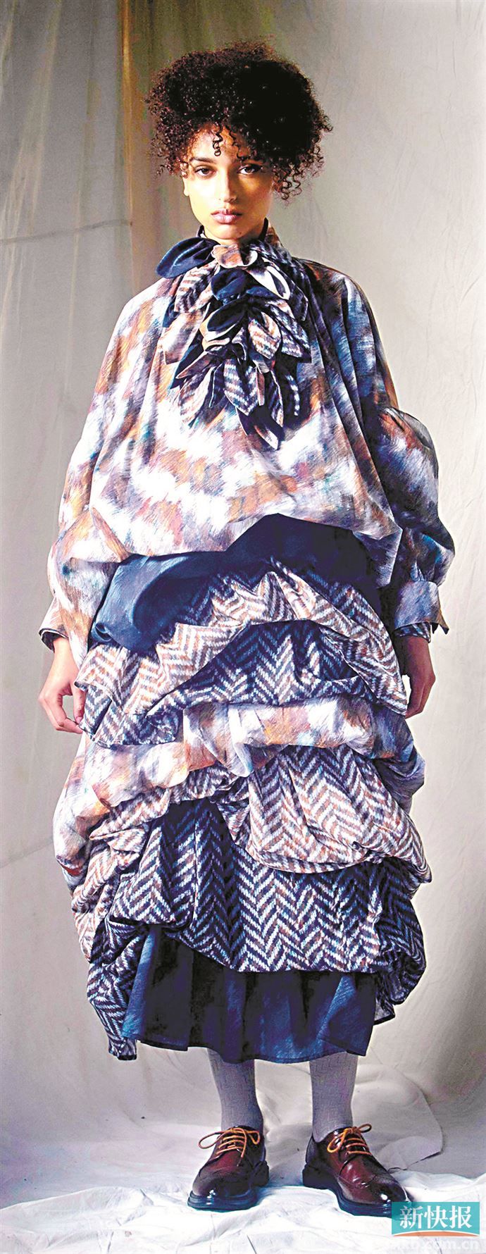 设计师更通过分层压褶、立体拼接等工艺强化蓬拢感避免臃肿,均匀压褶后分层拼接,让每一处泡泡轮廓清晰利落,行走时步履轻摇,显得既灵动又不失俏皮。