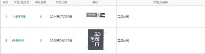 记者在国家知识产权局商标局官网检索发现,宝洁公司已注册两款含“3D炫白”字样商标,但商标样式与目前产品上显示的样式有所不同。