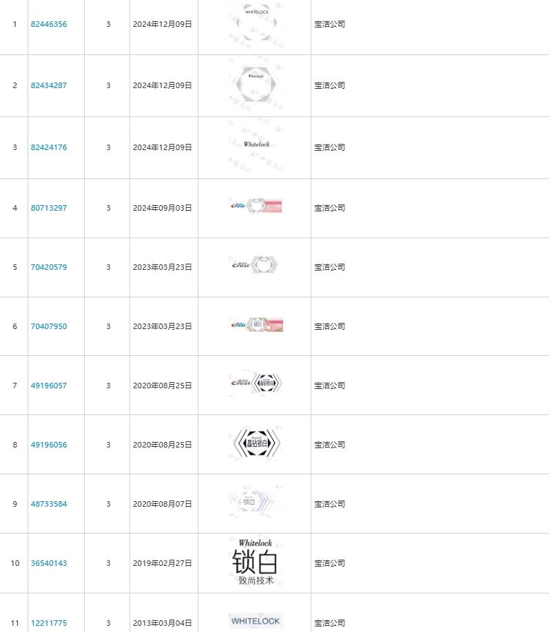 佳洁士“锁白”系列牙膏,也有类似现象。“锁白”系列牙膏上的“WHITELOCK”同样带有“TM”标志。国家知识产权局商标局官网信息显示,宝洁公司就不同样式的“锁白”“WHITELOCK”进行申请注册,一些样式已注册成功,一些则处于初审或无效状态。