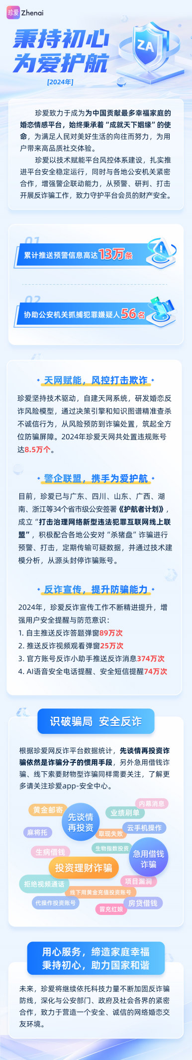 据悉,为治理平台网络生态环境,打击婚恋诈骗行为,珍爱网依托特有的天网反诈决策平台,研发婚恋反诈风险模型,通过决策引擎和知识图谱精准查杀不诚信行为;集合机器学习+人工审核,与黑产威胁猎人等外部合作,与公安进行诈骗和反制数据实时对接为基础层,对平台上的欺诈不诚信用户进行拦截处置;从风险预防到诈骗处置,为用户筑起全方位防骗屏障。2024年全年,珍爱网天网共处置违规账号8.5万个,有效净化了平台环境。