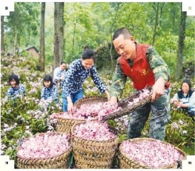 图为5月10日,贵州省赤水市长期镇党员干部在五七村帮助村民将采摘的金钗石斛花装筐。