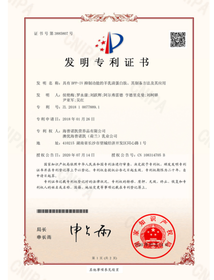 此次获奖的发明专利由佳贝艾特中荷研发团队共同申请,并已于2020年获得授权。该项发明专利中的DPP-IV抑制肽是一种天然降血糖功能因子,具有作用温和而持久、性质稳定、几乎无毒性反应、还可多种降糖成分并存综合起作用等优点。依据此项专利的技术,佳贝艾特可研发更多满足不同年龄层次营养需求的羊奶粉产品,为消费者提供更多元化的选择,以科技创新实力为支撑,为实现“佳贝艾特=羊奶代名词”的战略目标提供强大助力。