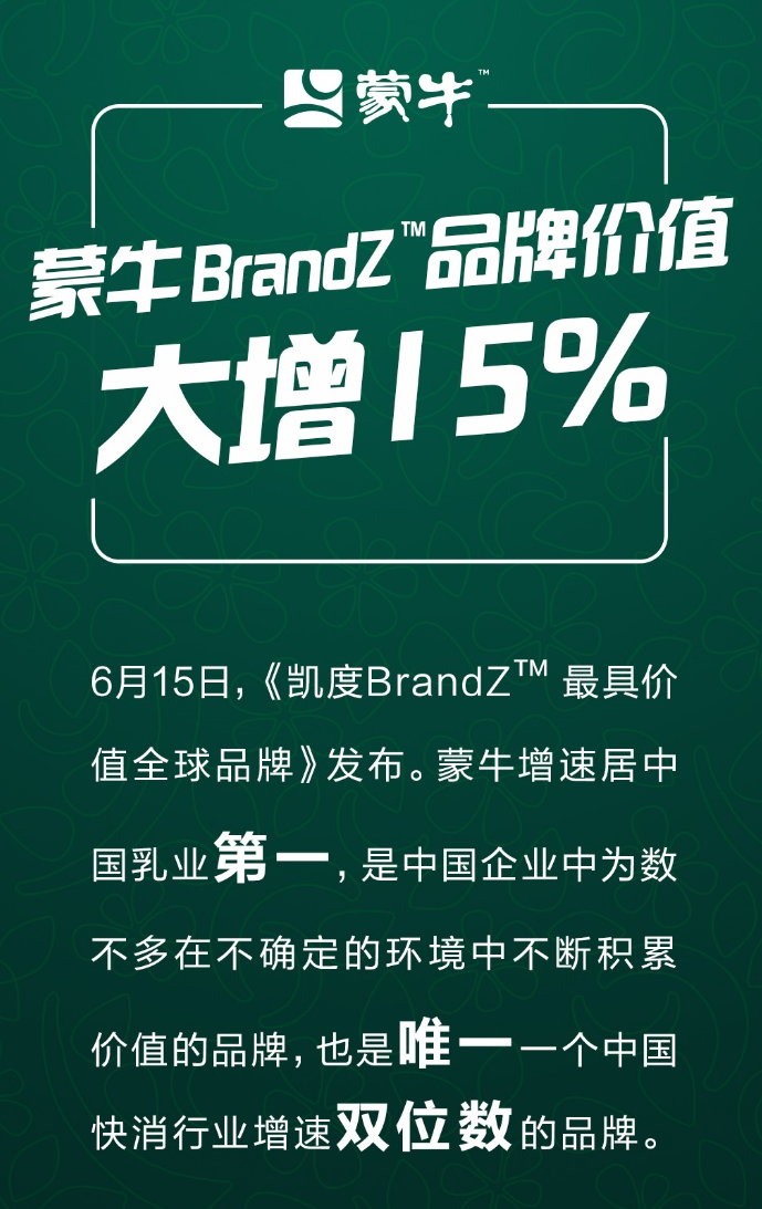 6月15日,2022年凯度BrandZ™最具价值全球品牌排行榜正式发布,蒙牛2022年品牌价值达到97.26亿美元,同比增15%。同时,蒙牛成为中国企业中为数不多在不确定的环境中不断积累价值的品牌,也是唯一一个中国快消行业增速达到双位数的品牌。