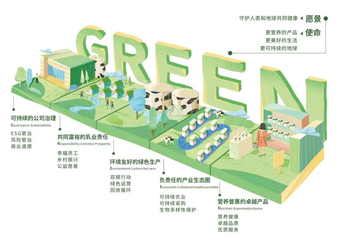 随着可持续发展深入人心,ESG已经成为企业品牌的重要组成部分。长年以来,蒙牛不忘“强壮国人”初心和“强乳兴农”责任,致力于打造全维度的ESG。蒙牛对标联合国可持续发展目标,围绕可持续的公司治理、共同富裕的乳业责任、环境友好的绿色生产、负责任的产业生态圈、营养普惠的卓越产品五大方向推进“GREEN可持续发展战略”,守护人类和地球共同健康。