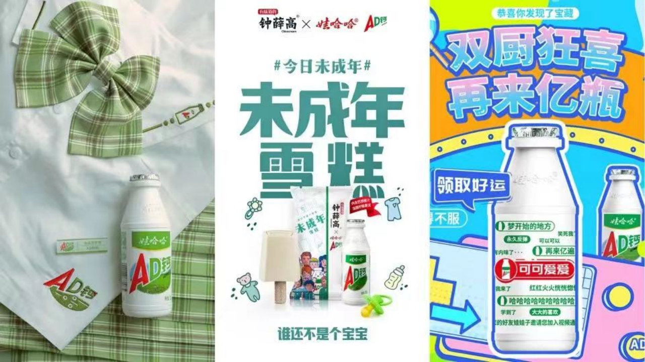 娃哈哈近年来的品牌焕新实绩有目共睹,在娃哈哈集团总经理宗馥莉的主导下,AD钙奶立足自身优势,自2018年起全面推动了IP化打造。从味觉角度入手,先后推出AD钙奶味的月饼、粽子、雪糕,让AD钙奶酸酸甜甜的经典味道突破了瓶身的限制;在重塑视觉上,以AD钙奶的自制表情包以及周边产品,不断加深IP视觉记忆,实现品牌新一代受众的圈粉;在品牌理念上,AD钙奶提出“今日未成年”的概念,借合作BilibiliWorld六一造节、定制DIMOO包装、泰迪珍藏包装等方式,继续向潮玩圈、二次元圈等各类圈层人群垂直延伸,为产品注入更加多元的“童心”理念。