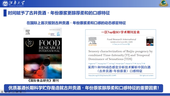上述的科学研究成果也在国际食品领域学术期刊进行了成果发表,在国际上首次报道古井贡酒·年份原浆柔和口感的动态感官特征,表明优质基酒长期科学贮存是造就古井贡酒·年份原浆醇厚柔和口感特征的重要因素。