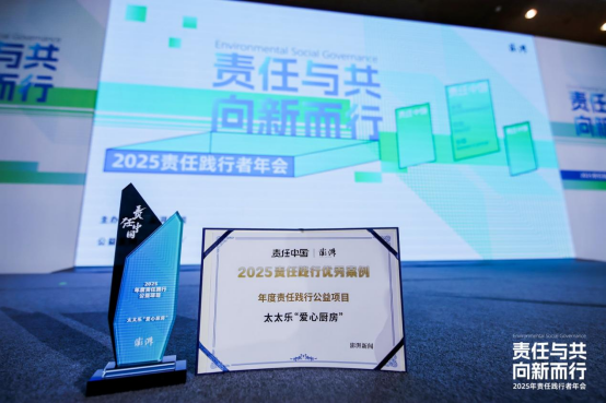 12月10日,2025澎湃新闻责任践行者年会在上海开幕。今年责任践行者年会以“责任与共 向新而行”为主题,邀请了来自政府机构、科研高校、国际NGO、国际评级机构及企业的多位重量级嘉宾共聚一堂,共同探讨全球气候变化、环境保护,以及企业如何践行ESG、推动高质量发展模式等热点话题。年会现场,太太乐“爱心厨房”项目凭借在社会责任领域的创新实践和长期深耕,入选“2025责任践行优秀案例”,并获评“年度责任践行公益项目”。