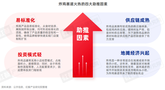 炸鸡赛道之所以能在竞争激烈的市场中持续火热,主要得益于以下四个关键助推因素:易标准化、供应链成熟、投资模式轻以及地摊经济的兴起。