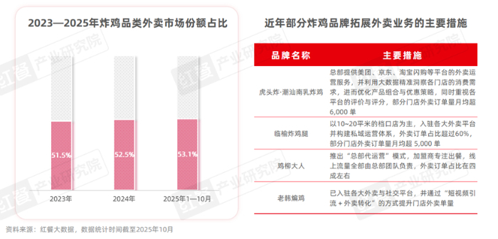 据红餐大数据,2023年以来,炸鸡品类的外卖市场份额占比一直超过50%,且有增长的趋势,2025年1—10月全国炸鸡门店的外卖市场份额占比达到了53.1%,较2023年提升了1.6个百分点。