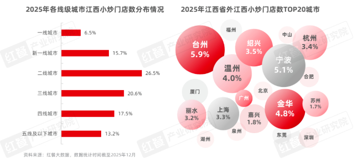 从城市分布来看,江西小炒在下沉市场具备强劲的渗透力。据红餐大数据,二线城市的江西小炒门店数量占比最高,达到26.5%;三线城市紧随其后,占比超过20%;新一线城市、四线城市、五线及以下城市的占比均在10%以上。值得注意的是,江西省以外的江西小炒门店数TOP20城市中,浙江省辖区内的城市占据将近一半席位,且排名均相对较前,比如台州、宁波、金华、温州、绍兴等。