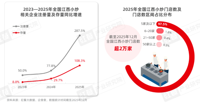 随着江西小炒热度持续上升,行业创业活跃度显著提升。据企查查数据,2024年以来江西小炒相关企业注册量与存量均呈大幅增长趋势,并进一步延续至2025年。据企查查数据,2025年相关企业注册量同比增长约287.5%,企业存量同比增长108.3%,由此看出餐饮创业者入局热情高涨。
