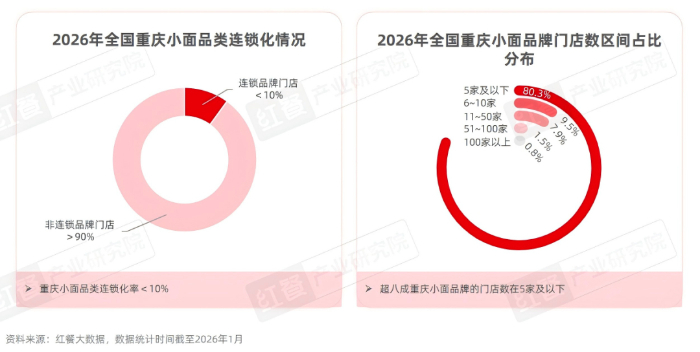 与面馆赛道相似,重庆小面赛道当前仍以夫妻店、街边摊为主,连锁化水平和品牌规模化程度整体偏低。红餐大数据显示,截至2026年1月,重庆小面品类连锁化率不足10%。其中,80.3%的品牌门店数在5家及以下,而门店数在100家以上的品牌数占比仅为0.8%。