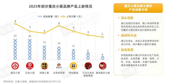 在产品创新方面,为保持品牌活力并吸引更多的消费者,众多重庆小面品牌纷纷加快产品创新步伐。据红餐产业研究院不完全统计,遇见小面、五味小面、阿赛小面、兵哥豌豆面、呼啦面馆等品牌在2025年推出的新品数量均超过10款,其中遇见小面与五味小面以22款新品位居榜首,阿赛小面则以15款新品位列第三。从上新频率来看,多数品牌保持了每季度推出新品的节奏。