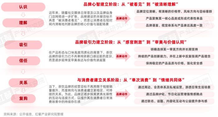 从茶饮消费路径来看,在品牌心智建立阶段,茶饮品牌通过清晰的定位、聚焦的产品结构以及统一的品牌语言与视觉体系,帮助消费者清晰地判断品牌价值与适配场景。在品牌吸引力阶段,茶饮品牌则通过稳定的审美方向、品质与价格以及持续的产品创新,增强对消费者的吸引力。在关系建立阶段,茶饮品牌则通过会员体系、私域运营及内容互动,将消费关系从一次性购买延伸为长期复购。