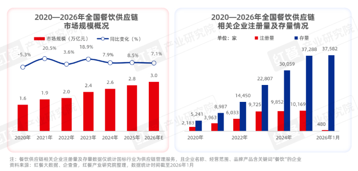 近年来,我国餐饮供应链市场规模呈持续增长态势。据红餐大数据,2025年餐饮供应链市场规模约为2.8万亿元,同比增长8.5%。红餐产业研究院预估,随着餐饮市场的持续扩容,连锁餐饮品牌对供应链需求持续增长,2026年餐饮供应链市场规模有望达到3万亿元。
