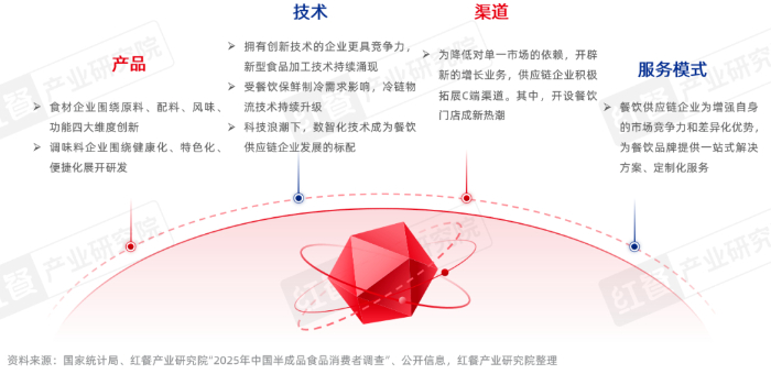随着下游餐饮市场的竞争进一步加剧,品牌对上游供应链的要求越来越高,为提高自身竞争壁垒、增强客户黏性,餐饮供应链企业也在不断优化和创新,以更具差异化的产品、更灵活的服务模式、更快的响应速度,支撑下游餐饮行业的连锁化扩张。据红餐产业研究院观察,餐饮供应链企业主要在产品、技术、渠道、服务模式等维度上创新。