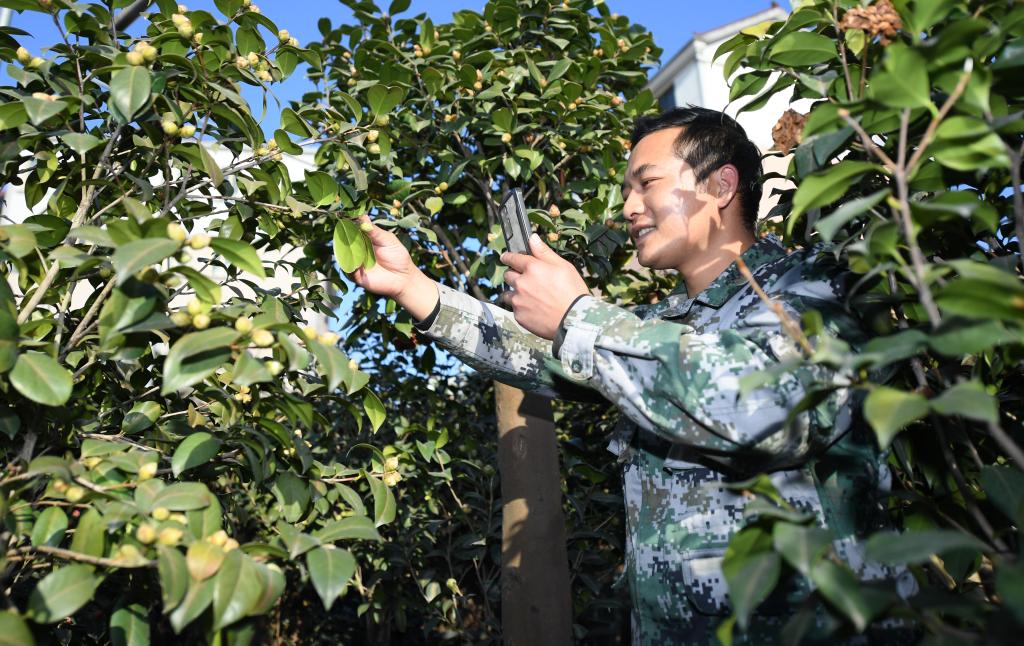 2021年1月14日,金华婺城区竹马乡下张家村电商高群亮在苗圃内向客户视频展示茶花孕蕾情况。新华社记者翁忻旸摄