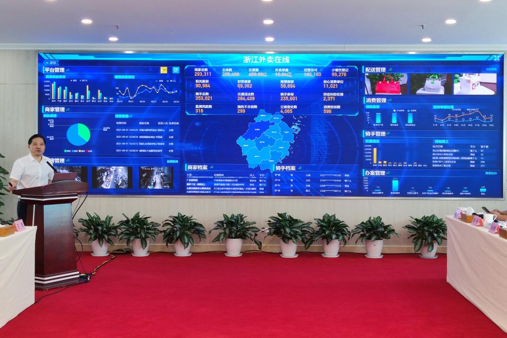 2021年9月2日,浙江省市场监管局局长章根明介绍“浙江外卖在线”上线近2个月来的成果。新华社记者林光耀摄