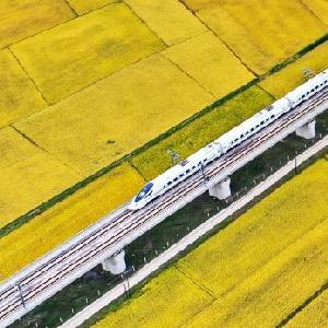 9月19日,高铁列车从吉林省公主岭市沃野间驶过(无人机照片)。新华社记者 张楠 摄