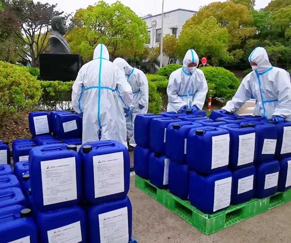 “工厂开足马力,不到一个月已经生产了230多吨3.5%浓度次氯酸钠消毒原液,可配置2.3万吨消毒水。”该公司副总经理邬刚说。