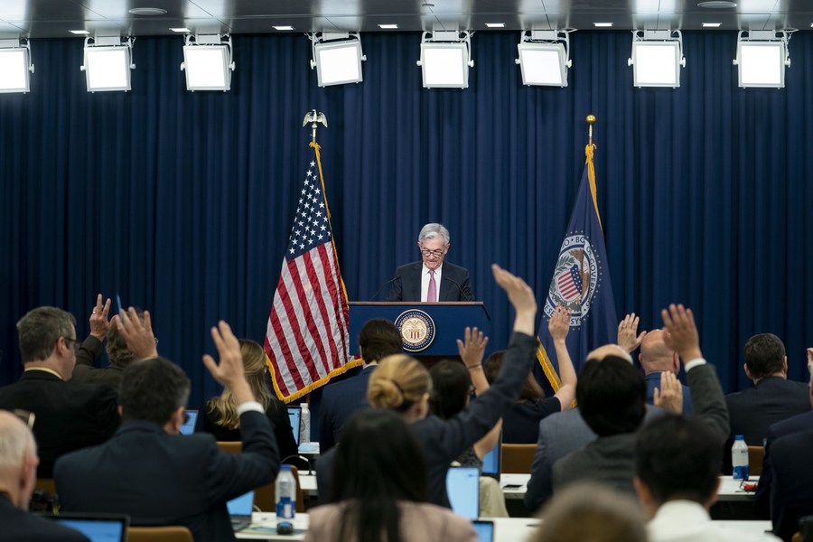 2022年5月4日,在美国首都华盛顿,美国联邦储备委员会临时主席鲍威尔出席新闻发布会。新华社记者刘杰摄