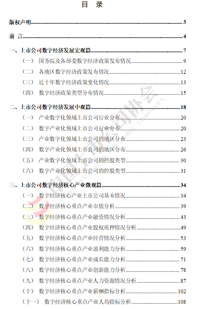 宏观层面,《白皮书》从数字经济政策环境出发,借鉴经济合作与发展组织(OECD)发布的《走向数字化综合政策框架》和国务院印发的《“十四五”数字经济发展规划》,提炼出22项关键政策领域和指标,对2012年以来各部门、地区发布的政策在22项政策指标的聚合、时间分布、行业分布、地区分布等情况进行了分析;中观层面,《白皮书》基于《数字经济行业分类》,围绕数字产品制造业、数字产品服务业、数字技术应用业、数字要素驱动业和数字化效率提升业等内容,考察辖区、不同控股类型上市公司的数字经济实体分布;微观层面,《白皮书》选择了数字经济核心领域上市公司群体,从市值、营收、研发投入和人力资源等方面分析数字经济核心领域上市公司的成长性、创新能力、融资情况、人均创收、人均创利及人均薪酬等情况。《白皮书》还单立篇章,围绕上市公司数字化转型的现状、投入情况、实现路径、转型效果、转型难点等5个维度,基于调研数据分析了上市公司数字化和实体经济融合的现状。