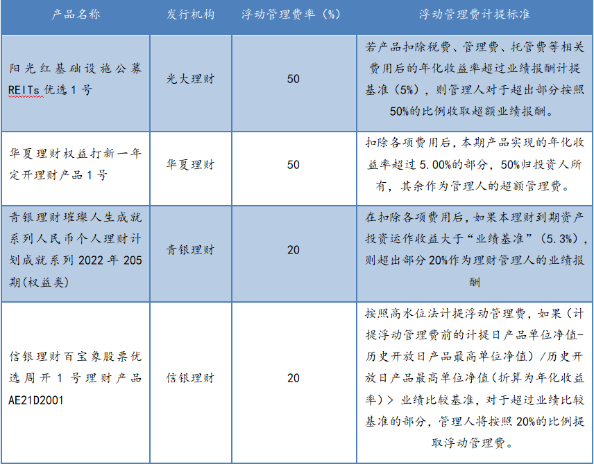 值得注意的是,权益类理财产品除基础的固定管理费、托管费和销售服务费外,部分产品会取得超额收益时对超过设定业绩比较基准的部分按一定比例收取浮动管理费,该费率的收取比例由各家机构自行设定,存在一定差异。