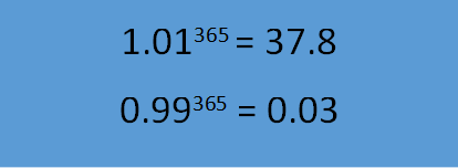 有一则常被使用的“1.01的365次方”励志公式(见下图),以此激励大家“每天多努力一点点(1%),人生的积累会有大不同;而每天倦怠一点点(1%),会离起点越来越远陷入深渊”。