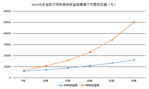 5000元本金在不同年限和收益率情境下可累积总额(元)