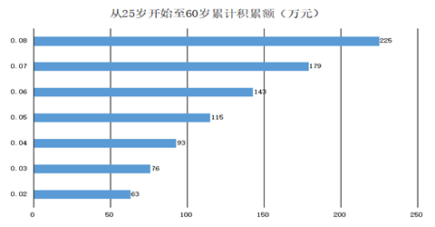 假设25岁的小王计划每年末固定为养老储备12000元,直至60岁退休,不同的年收益率水平下,最终累计积累额如下: