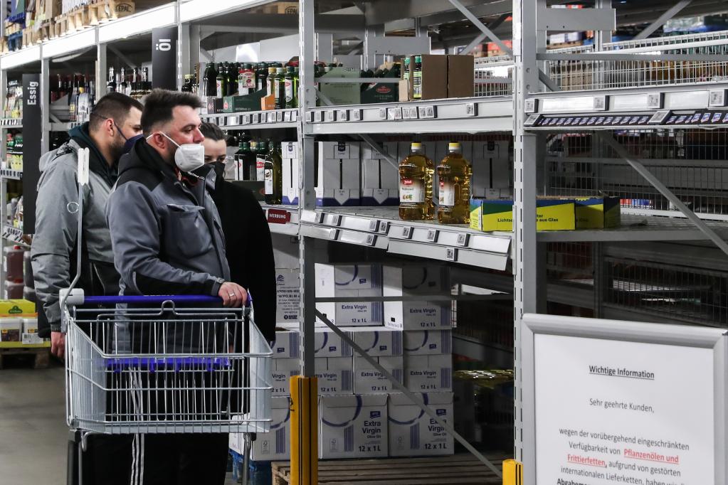 2022年3月26日,在德国首都柏林的一家超市,顾客站在商品短缺的食用油货架前。新华社照片单宇琦摄