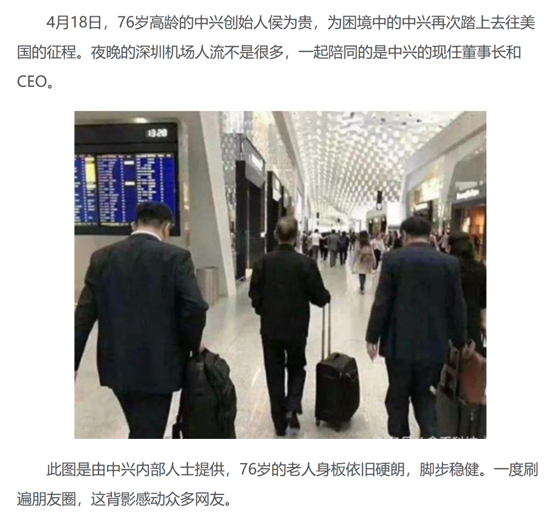 在制裁事件期间,一张侯为贵推着行李箱现身深圳机场的图片曾刷屏朋友圈,图片意为侯为贵再度出山、为制裁事件奔波。这也是在侯为贵退休后,为数不多引发大量关注的公开行程。而在危机解决后,侯为贵再度淡出视野,中兴通讯交给了新任管理层。