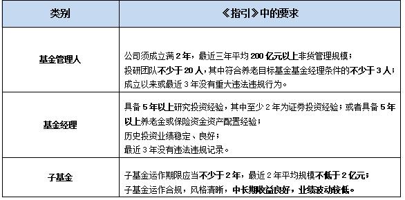 此外,《指引》对养老目标基金的基金管理人、基金经理、以及基金投向的标的基金(简称“子基金”)分别做了详细的规定,总体上比普通基金的要求更严、标准更高。