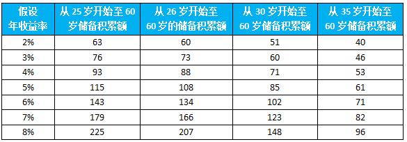 表:不同年龄开始、不同收益率水平下测算的累计养老储备额(万元)