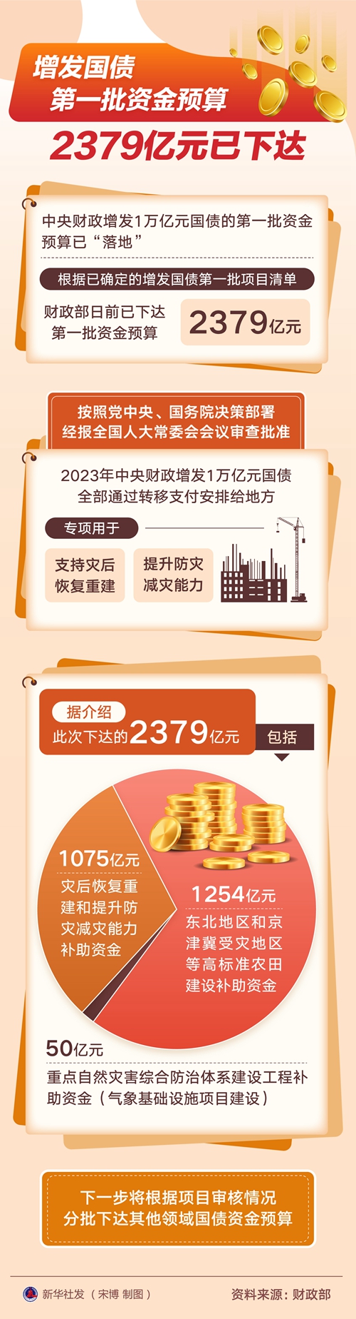 此前,多部门联合成立了增发国债项目实施工作机制,并确定了第一批项目清单。根据已确定的项目,财政部下达了第一批国债资金预算2379亿元。