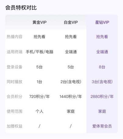 爱奇艺黄金VIP定位于个人自用,用户可在手机/电脑/平板电脑5台设备上登录,同时可播放设备数为1台。白金VIP和星钻VIP均定位于家庭使用,在黄金VIP权益基础上加享电视端大屏观影体验和帧绮映画MAX高品质视听。其中,白金VIP为家庭优享订阅,可享5台设备登录和2台设备同时播放,星钻VIP为家庭尊享订阅,权益升级后可享8台设备登录和3台设备同时播放。与此同时,星钻VIP会员还可享爱体育会员权益,满足家庭成员多元内容需求。