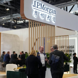 2024年10月21日,与会嘉宾在SWIFT国际银行业运营大会2024年会摩根大通展位前交流。当日,SWIFT(环球银行金融电信协会)国际银行业运营大会2024年会在北京开幕。 新华社记者 鞠焕宗 摄