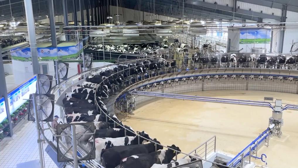 在蜂蜜香气的吸引下,一头头奶牛走向无人挤奶机,机械臂灵敏地进行消毒、套杯、挤奶,新鲜牛奶便源源不断生产出来。
