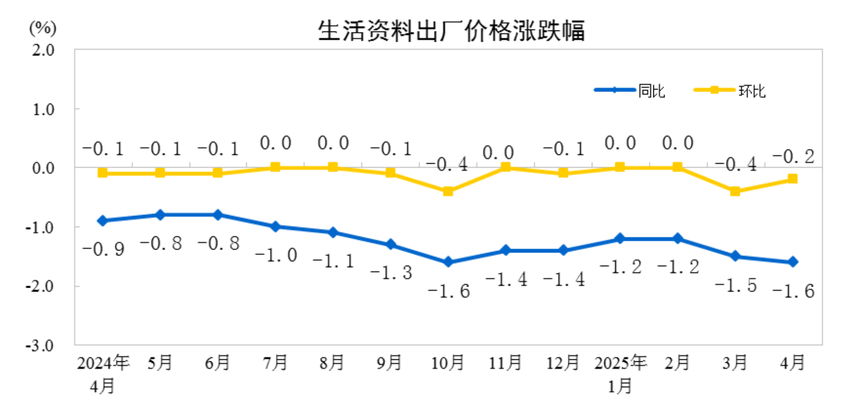 2025年4月份,全国工业生产者出厂价格同比下降2.7%,环比下降0.4%;工业生产者购进价格同比下降2.7%,环比下降0.6%。1—4月平均,工业生产者出厂价格和购进价格比上年同期均下降2.4%。
