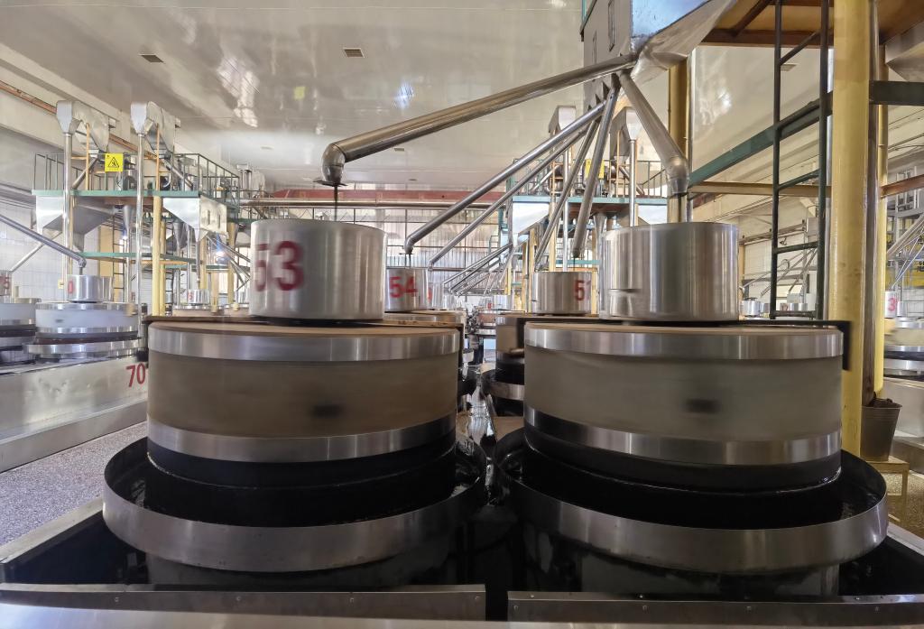 在瑞福油脂股份有限公司生产车间,大型石磨设备正在研磨芝麻。新华社记者王志 摄