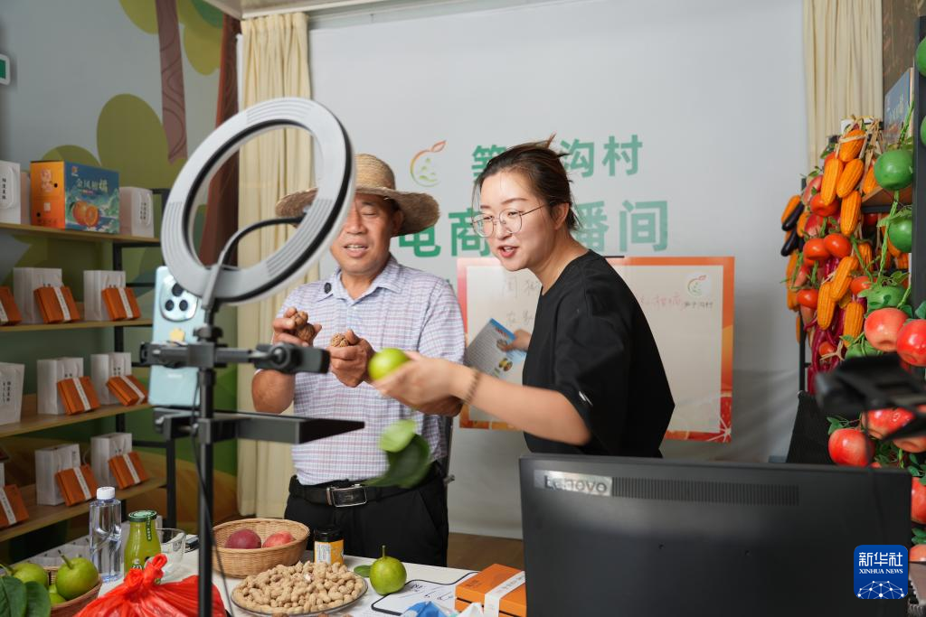 6月17日,在四川省广元市苍溪县陵江镇笋子沟村电商直播间,村支部书记张桂华(左)和村民一起直播。新华社发(王韬摄)