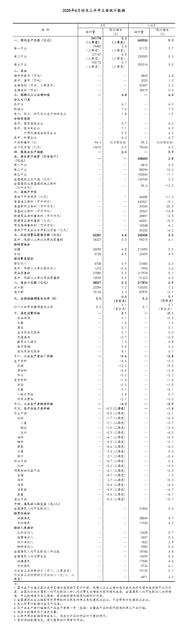 (2)根据季节调整模型自动修正结果,对近一年来各期国内生产总值、规模以上工业增加值、固定资产投资(不含农户)、社会消费品零售总额环比增速进行修订。修订结果及2025年二季度GDP环比数据、2025年6月份其他指标环比数据如下: