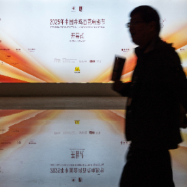 11月11日,2025中国金鸡百花电影节在福建省厦门市开幕。一名男子在闽南大戏院的电影节海报栏前经过。新华网记者 钟奕摄